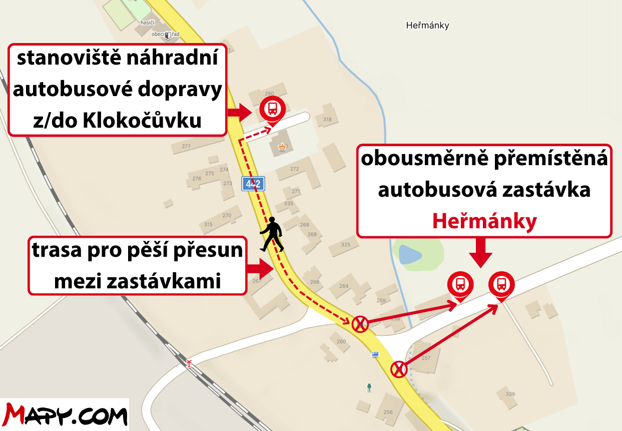 Mezi obcemi Heřmánky a Klokočůvek bude zavedena náhradní doprava s nutností pěšího přesunu mezi přemístěnou zastávkou Heřmánky a stanovištěm náhradní autobusové dopravy u prodejny Hruška.