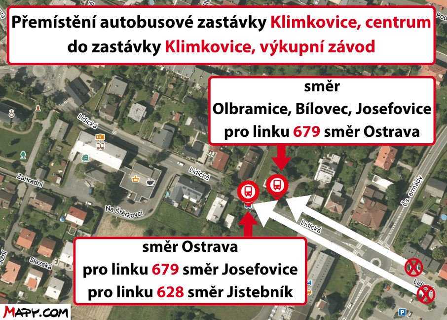Dočasné přemístění autobusové zastávky Klimkovice, centrum