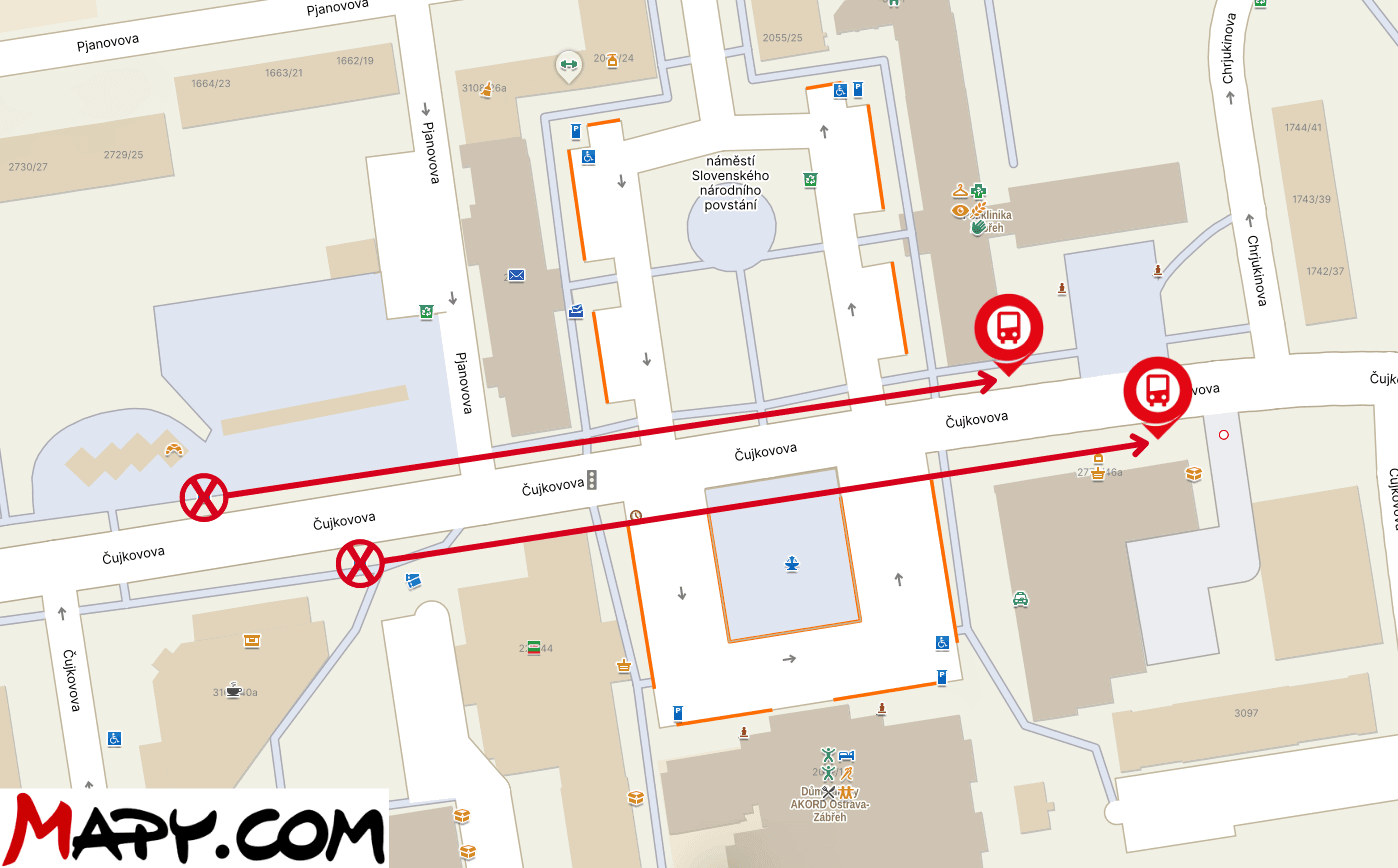 Od čtvrtku 23. dubna 2026 (07:00 h) do pondělí 4. května 2026 (08:00 h), z důvodu rekonstrukce kanalizace na ul. Čujkovova, dojde k přemístění zastávek Náměstí SNP na provizorní zastávky.